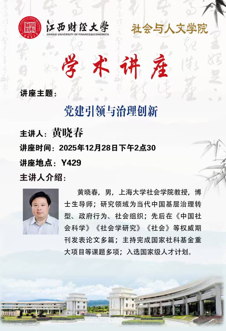 12月28日,上海大学人文社会科学处处长、社会学院黄晓春教授应邀回到家乡南昌,为成人视频 师生带来了一场题为“党建引领与社会治理创新”的学术讲座。讲座聚焦党建引领的制度内涵、实现机制、制度条件与现实意义,通过丰富的案例分析与理论阐释,呈现了一场兼具学术深度与实践温度的思想盛宴。讲座由蒋国河院长主持,成人视频 相关专业教师及学生积极参与。