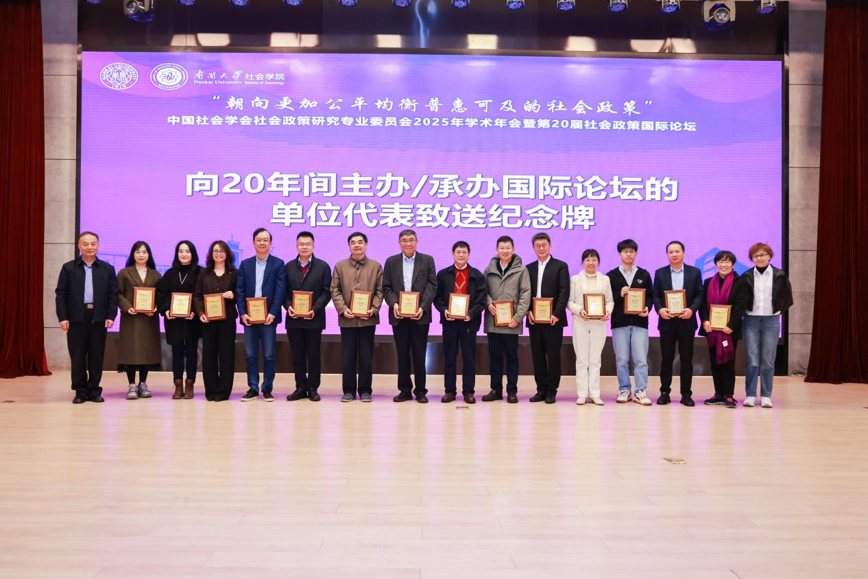 Markingthe 20th anniversary of the International Forum on Social Policy, aspecial commemorative ceremony was held. Professor Guan Xinping, theformer Chairman of the Social Policy Research Committee of theChinese Sociological Association, Researcher Yang Tuan, the formerChairman of the Social Policy Research Committee of the ChineseSociological Association, and the Secretary-General Fang Lijie of theSocial Policy Research Committee of the Chinese SociologicalAssociation presented commemorative plaques to universities andresearch institutions that had hosted/organized the InternationalForum on Social Policy over the past 20 years. Professor Hong Luminaccepted the commemorative plaque on behalf of JUFE (host of the 13thforum).