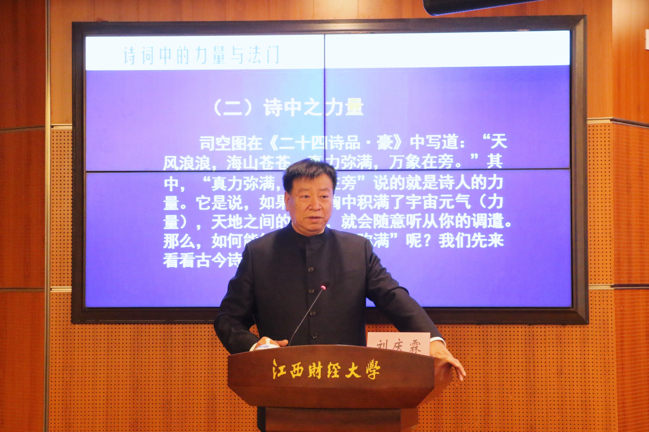 本场讲座由我校副校长李春根教授主持。他指出讲座是在教务处、成人视频 、中华优秀传统文化教育与传播中心、新文科教育教学研究中心的支持下举办的。我校中华优秀传统文化教育与传播中心自2024年6月成立以来,紧紧围绕学习贯彻习近平文化思想这一主线,将弘扬中华优秀传统文化与推广国家语言文字紧密结合,扎实推进“一馆、一园、一基地、一课”建设,系统开展了经典诵写讲、读书报告会、新文科大讲堂等文化活动,让传统文化在新时代焕发生机。今年以来,中心进一步深化教育教学改革,推动中华优秀传统文化全方位融入育人体系,在文化传承与创新方面取得了扎实成效。刘庆霖作为业界知名人物,在中华诗词创作与研究领域造诣颇深、成果显著,他的到来为我校新文科大讲堂增添了浓墨重彩的一笔!江西省财政厅副厅长王斌、江财沁缘诗社常务副社长章新挺、工商管理学院书记贺三宝、校老年诗词协会理事喻春龙与陈光秀作为嘉宾也出席了讲座。