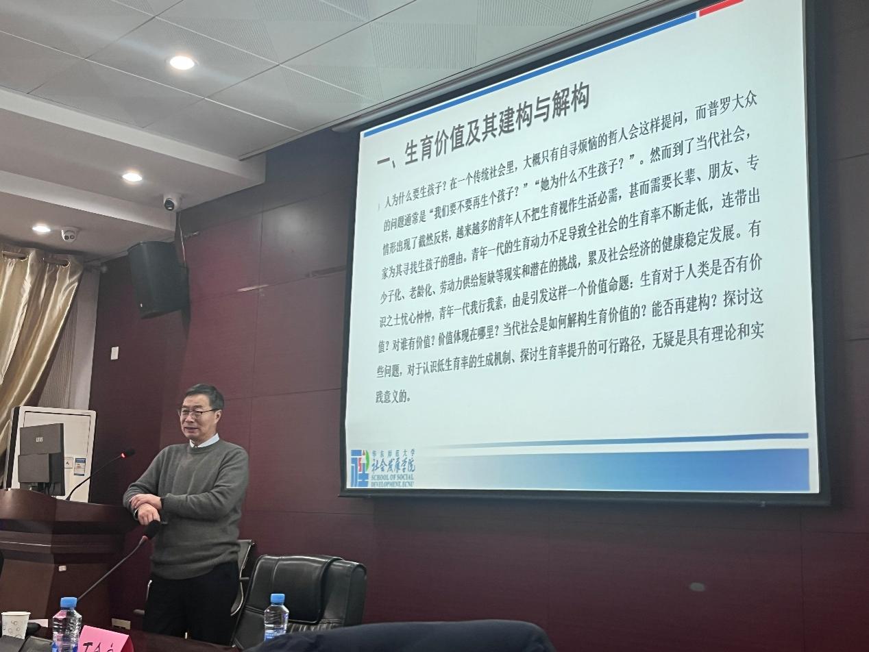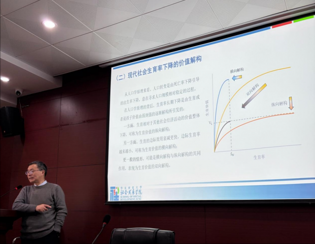 讲座伊始,丁金宏教授以“人为什么要生孩子”这一核心命题切入,梳理了传统社会到现代社会生育观念的颠覆性转变。他指出,传统社会中生育行为承载着多重核心价值:在情感层面,它既是夫妻关系的“黏合剂”,也是代际情感的“传递纽带”;在安全层面,它构成了家族延续、防卫保障乃至城邦国防的基础;在财富层面,通过提供劳动力和养老保障,形成了“多子多福”的正向财富流动;在礼俗层面,生育则帮助人们规避社会歧视、维系家庭在礼教中的地位。这四大价值共同支撑了传统社会的高生育率。